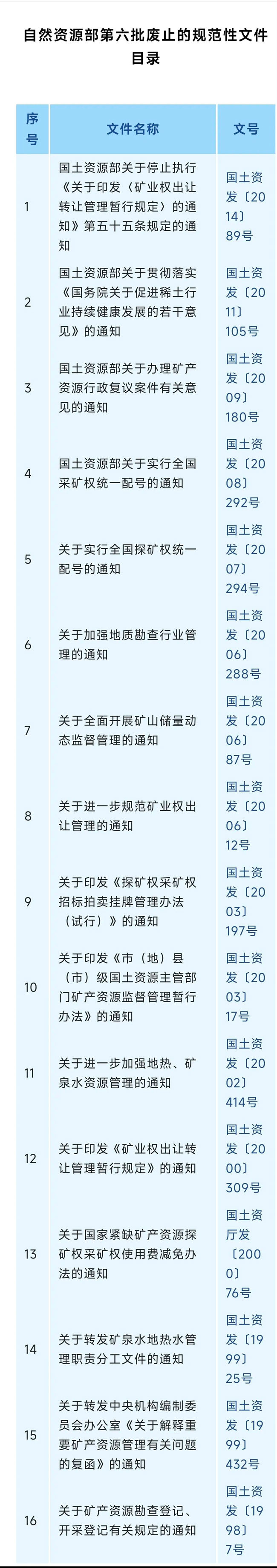 日前,《自然資源部第六批廢止的規(guī)范性文件目錄》公布,廢止16件涉及礦產(chǎn)資源管理的相關(guān)規(guī)范性文件(詳見(jiàn)下表)。