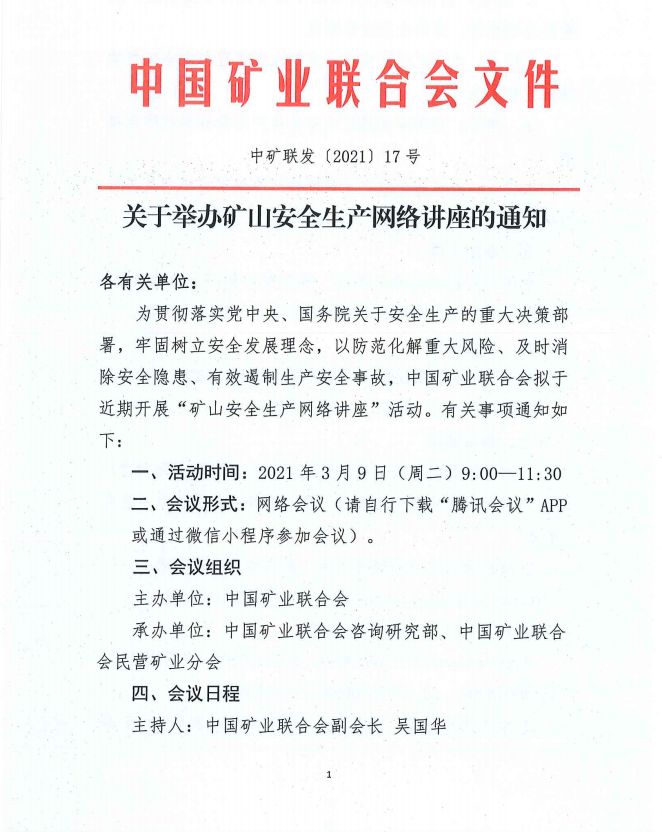 中國礦業(yè)聯(lián)合會關(guān)于舉辦礦山安全生產(chǎn)網(wǎng)絡講座的通知