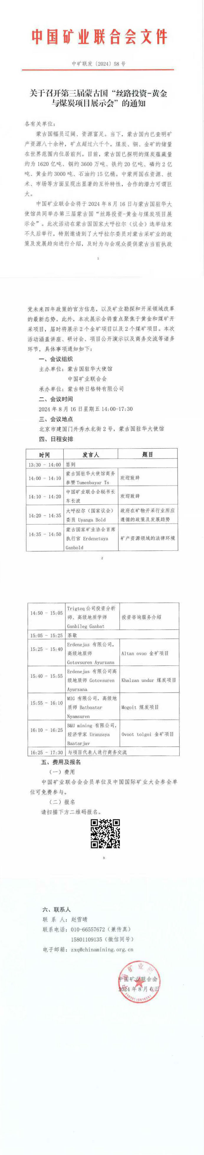 關(guān)于召開第三屆蒙古國“絲路投資-黃金與煤炭項(xiàng)目展示會(huì)”的通知