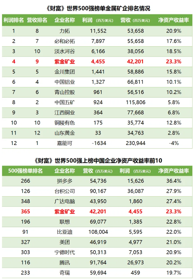 《財富》世界500強發(fā)布:紫金礦業(yè)凈資產(chǎn)收益率居中國企業(yè)第4、全球金屬礦企第1