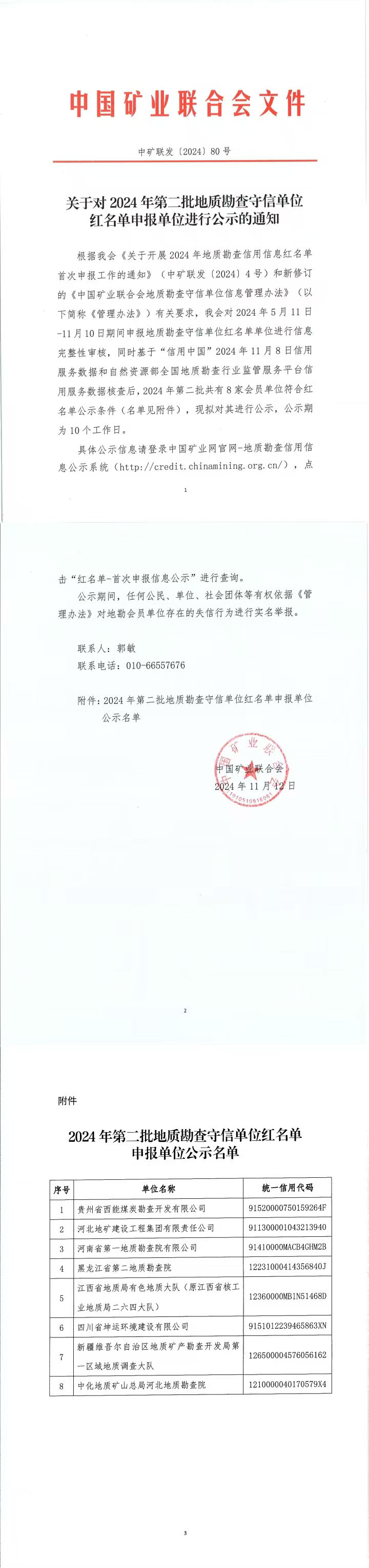 根據(jù)我會《關(guān)于開展2024年地質(zhì)勘查信用信息紅名單首次申報工作的通知》(中礦聯(lián)發(fā)[2024]4號)和新修訂的《中國礦業(yè)聯(lián)合會地質(zhì)勘查守信單位信息管理辦法》(以下簡稱《管理辦法》)有關(guān)要求,我會對2024年5月11日-11月10日期間申報地質(zhì)勘查守信單位紅名單單位進行信息完整性審核,同時基于“信用中國”2024年11月8日信用服務(wù)數(shù)據(jù)和自然資源部全國地質(zhì)勘查行業(yè)監(jiān)管服務(wù)平臺信用服務(wù)數(shù)據(jù)核查后,2024年第二批共有8家會員單位符合紅名單公示條件(名單見附件),現(xiàn)擬對其進行公示,公示期為10個工作日。