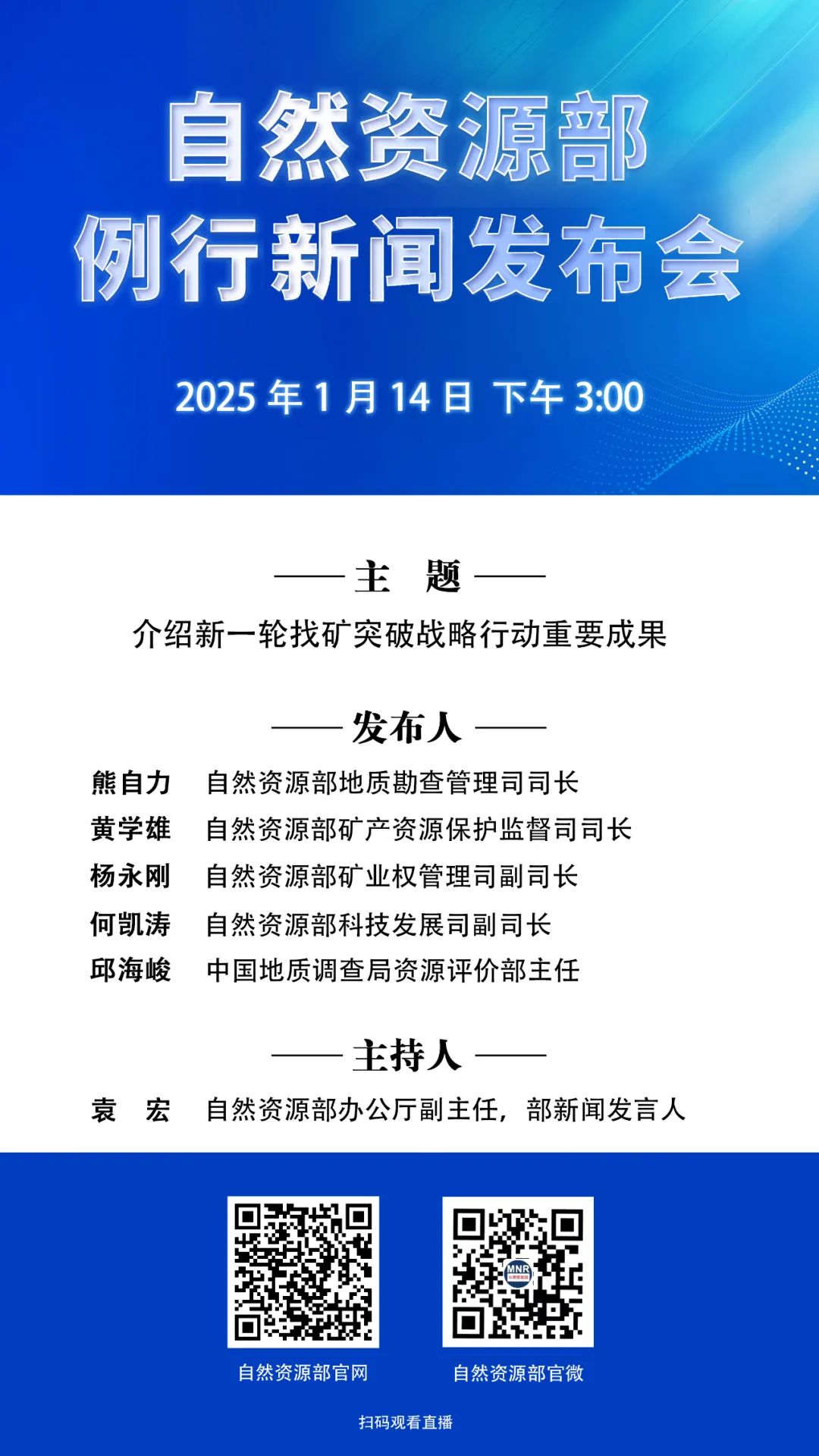 1月14日下午3:00!自然資源部舉行例行新聞發(fā)布會(huì)——介紹新一輪找礦突破戰(zhàn)略行動(dòng)重要成果