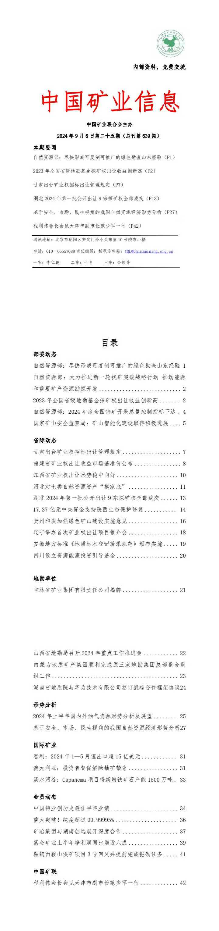 中國礦業(yè)網(wǎng):2024年9月2日—9月6日《中國礦業(yè)信息》第二十五期