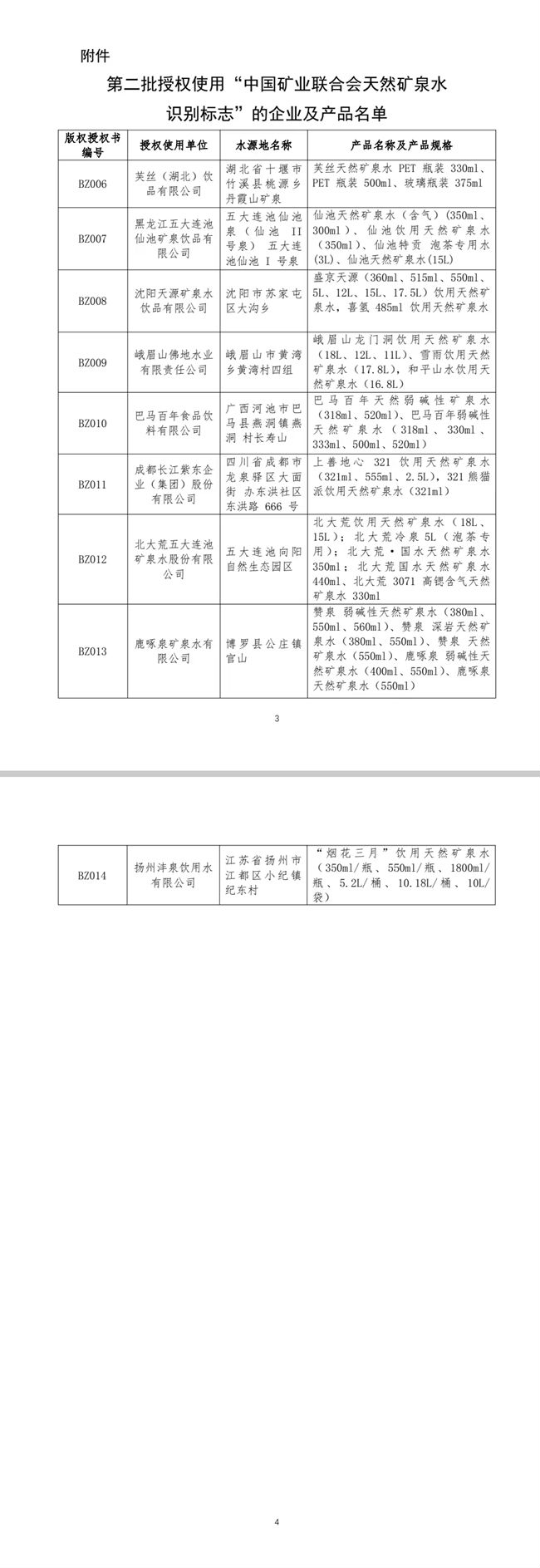 附件:第二批授權(quán)使用“中國(guó)礦業(yè)聯(lián)合會(huì)天然礦泉水識(shí)別標(biāo)志”的企業(yè)及產(chǎn)品名單
