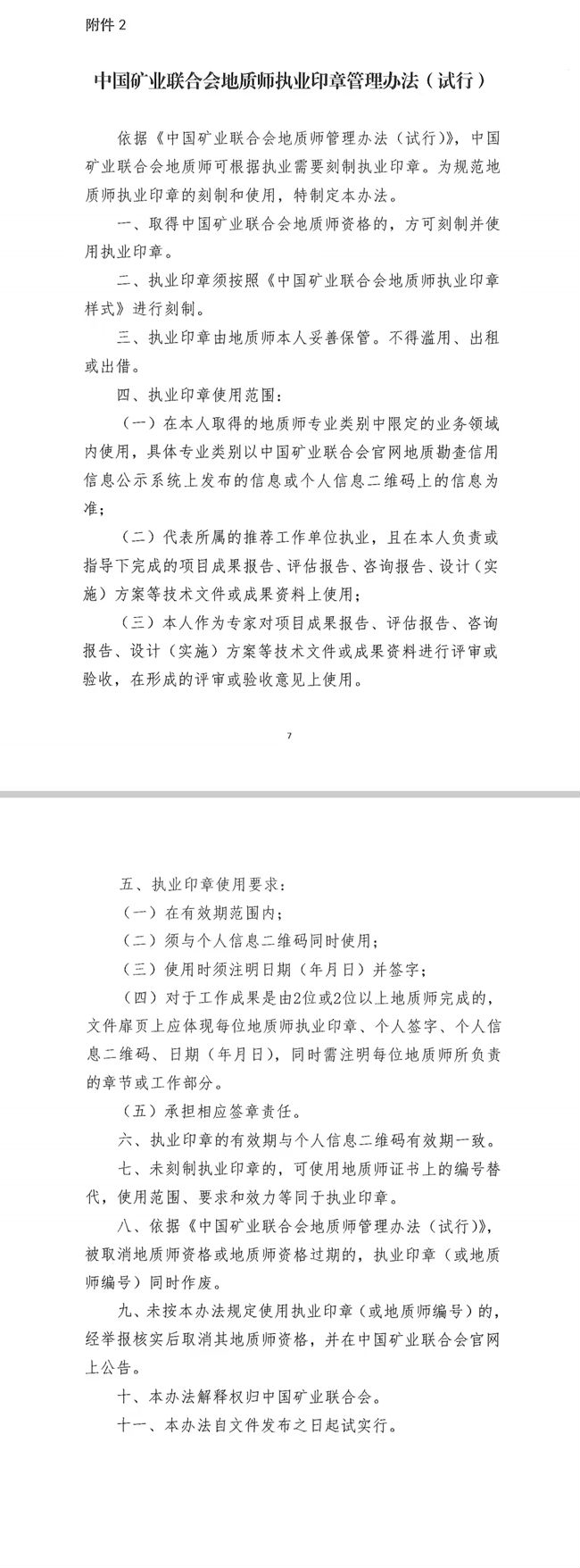 2.《中國礦業(yè)聯(lián)合會地質(zhì)師執(zhí)業(yè)印章管理辦法(試行)》