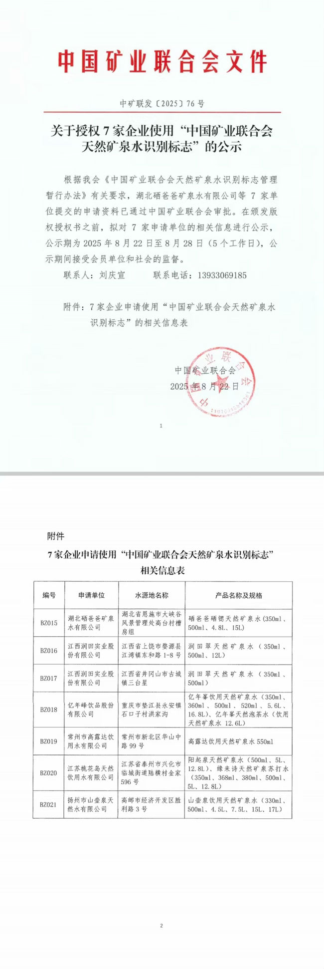 關(guān)于授權(quán)7家企業(yè)使用“中國礦業(yè)聯(lián)合會天然礦泉水識別標志”的公示