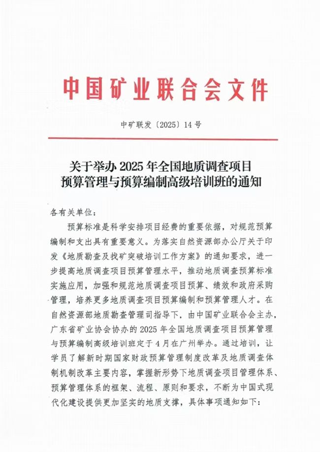 由中國礦業(yè)聯(lián)合會(huì)主辦,廣東省礦業(yè)協(xié)會(huì)協(xié)辦的2025年全國地質(zhì)調(diào)查項(xiàng)目預(yù)算管理與預(yù)算編制高級(jí)培訓(xùn)班2025年4月9-11日在廣州舉辦。通過培訓(xùn),讓學(xué)員了解新時(shí)期國家財(cái)政預(yù)算管理制度改革及地質(zhì)調(diào)查體制機(jī)制改革主要內(nèi)容,掌握新形勢(shì)下地質(zhì)調(diào)查項(xiàng)目管理體系、預(yù)算管理體系的框架、流程、原則和要求,不斷為中國式現(xiàn)代化建設(shè)提供更加堅(jiān)實(shí)的地質(zhì)支撐。