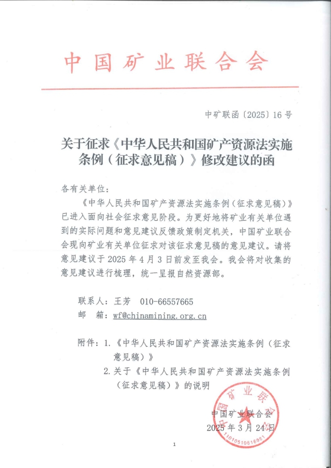 關(guān)于征求《中華人民共和國礦產(chǎn)資源法實施條例(征求意見稿)》修改建議的函