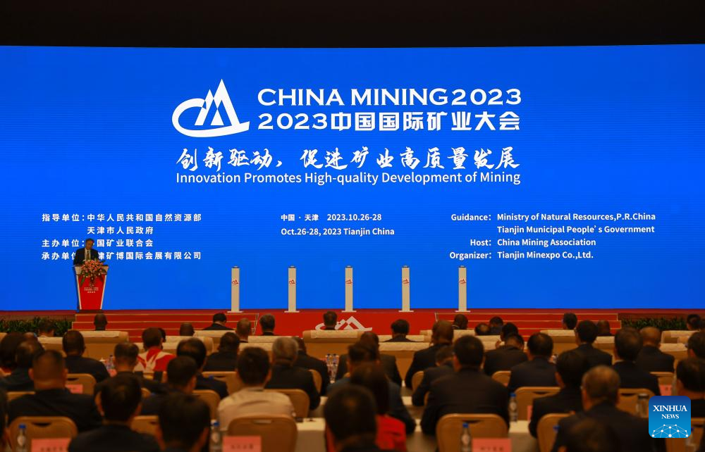 This photo taken on Oct. 26, 2023 shows the opening ceremony of the 25th China Mining Conference and Exhibition at Tianjin Meijiang Convention Center in north China's Tianjin Municipality. The 25th China Mining Conference and Exhibition opened here on Thursday, attracting more than 260 exhibitors and approximately 5,000 visitors from nearly 30 countries and regions.